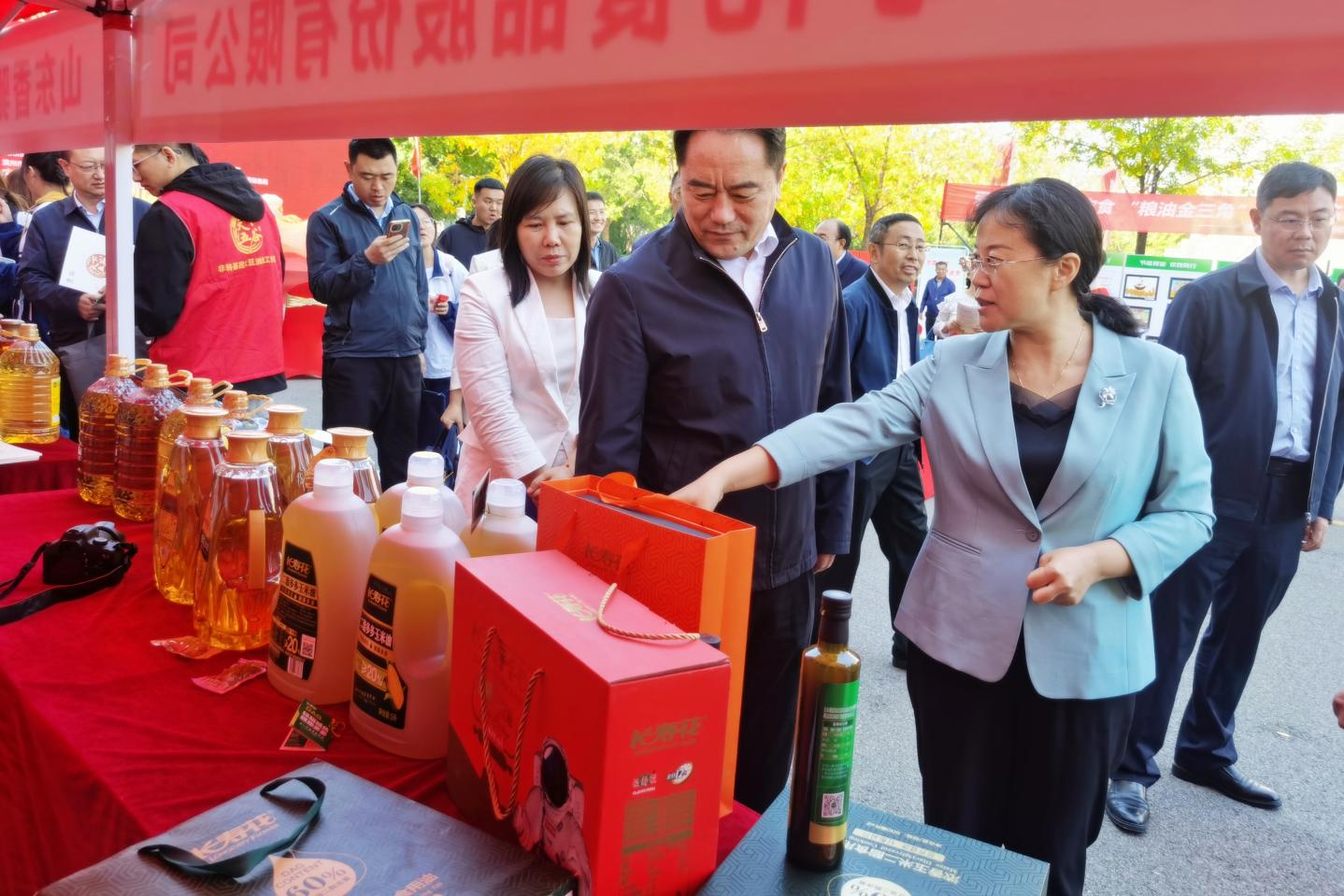 活動現場,與會嘉賓、朋友來到長壽花展位前咨詢洽談,工作人員詳細介紹了參展產品及品質特性等,重點科普了甘油二酯油健康新品及健康膳食理念。期間,山東省糧食和物資儲備局黨組成員、副局長王偉,濱州市副市長畢志偉,濱州市糧食和物資儲備局黨組書記、局長藺兵川等領導蒞臨長壽花展臺巡展指導,認真聽取產業發展、產品創研等情況介紹,對甘油二酯油等高技術含量、高附加值產品的創新研發及全民推廣工作給予了充分肯定。